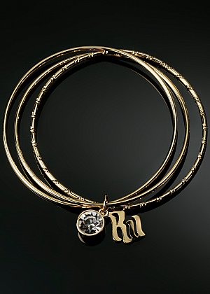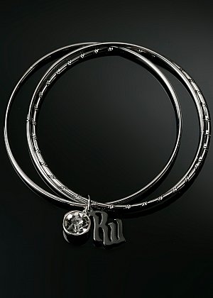 This style is hot! Two solid bangles and a textured one are connected by a thin O-ring that has a hanging crystal charm as well as your favorite brand's flame logo.